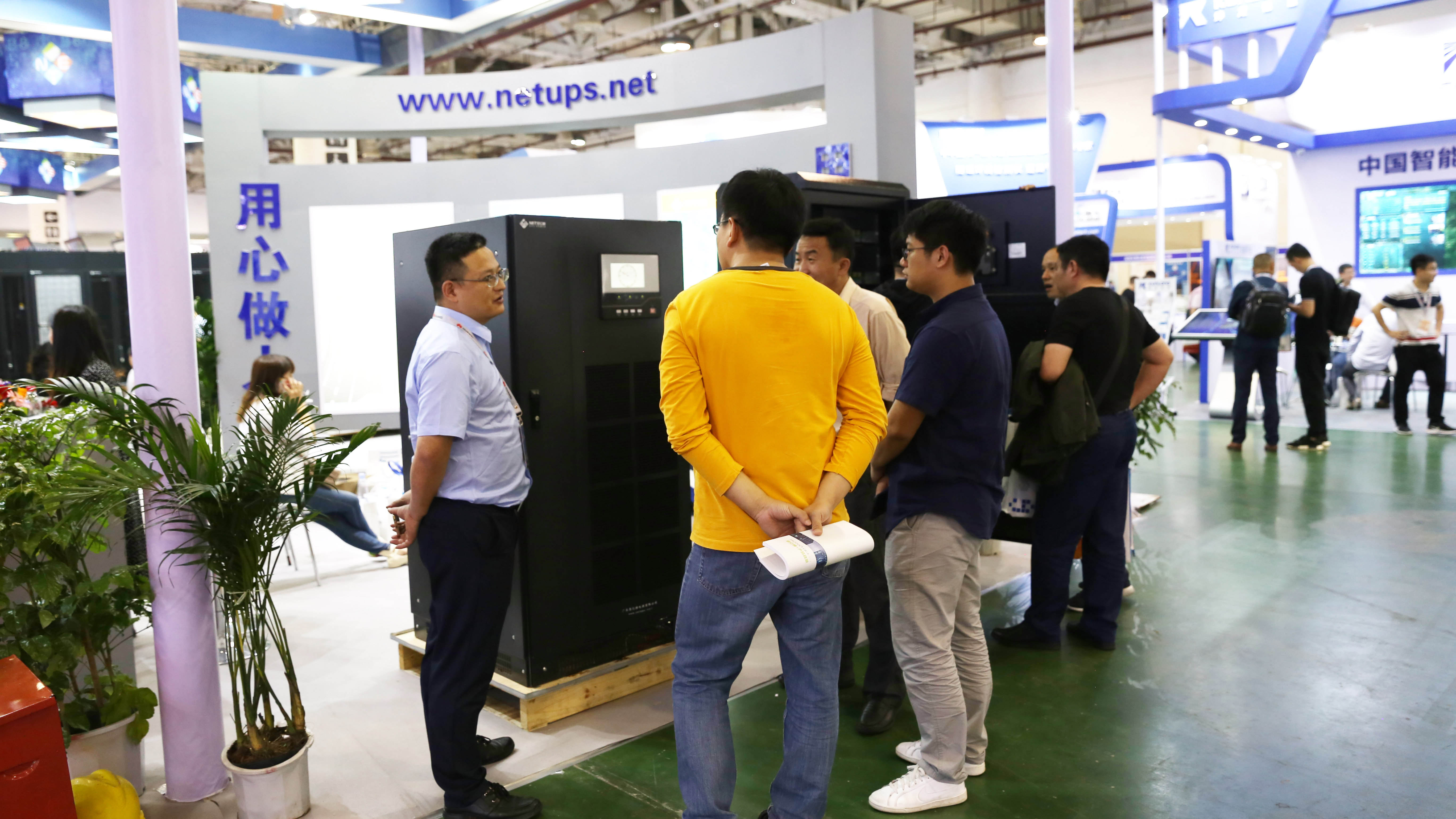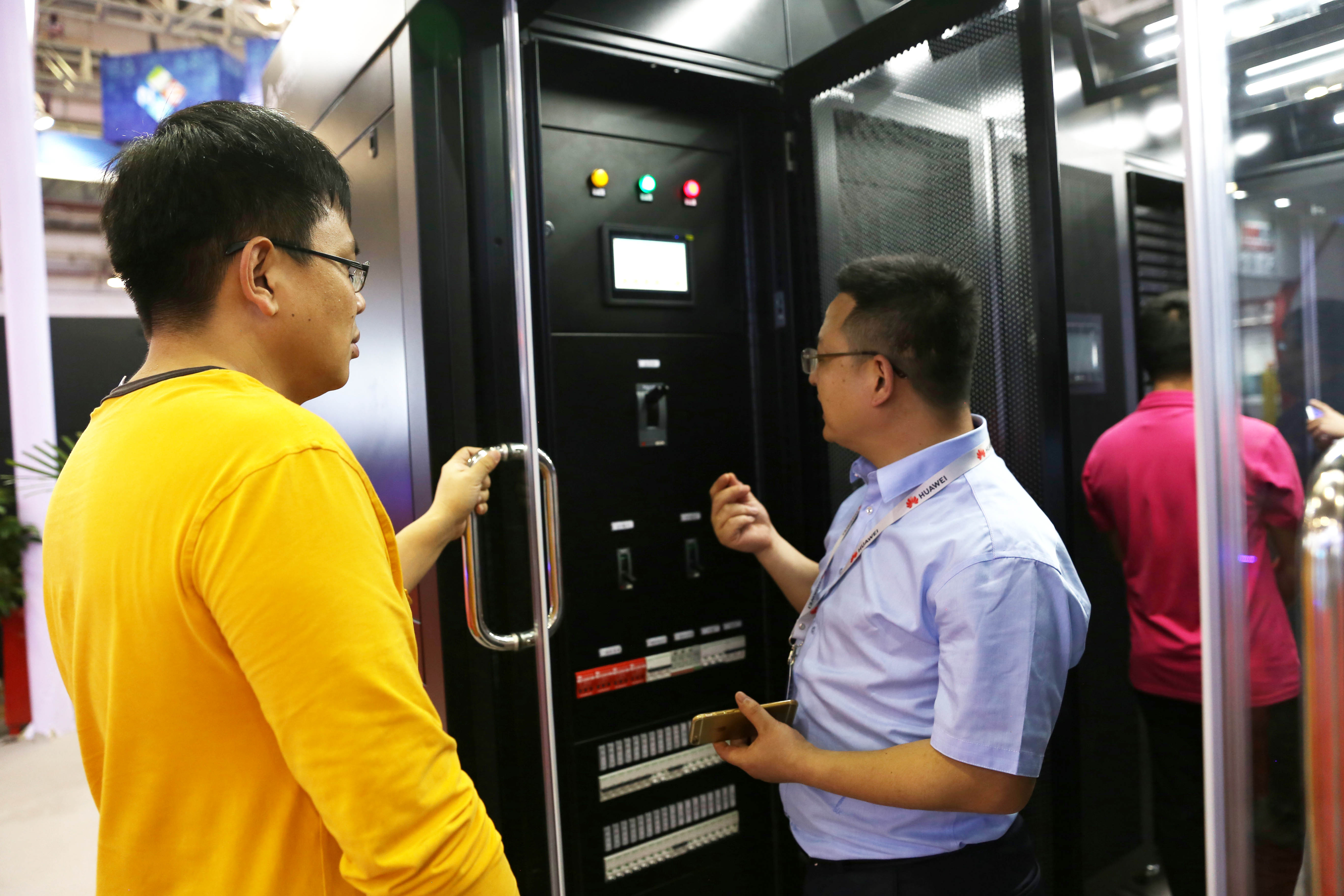 工作人員向客戶介紹模塊化數(shù)據(jù)中心的應(yīng)用領(lǐng)域